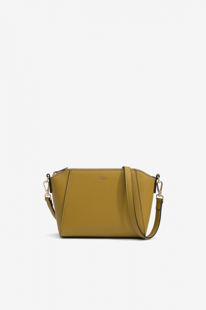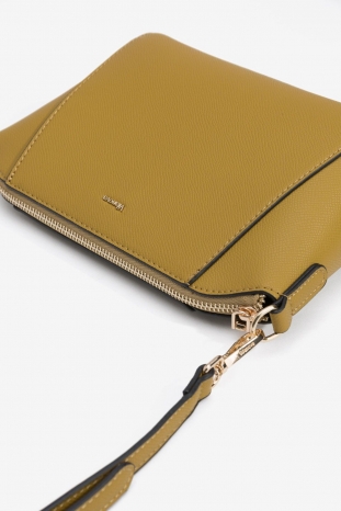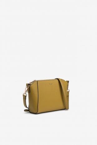 Bolso bandolera efecto piel granulada en color mostaza con cierre de cremallera superior. Bandolera ajustable y extraíble y bolsillo interno con cremallera.