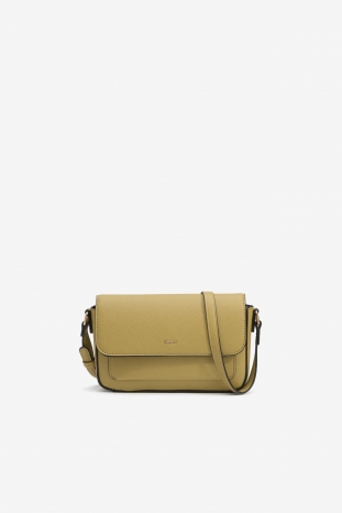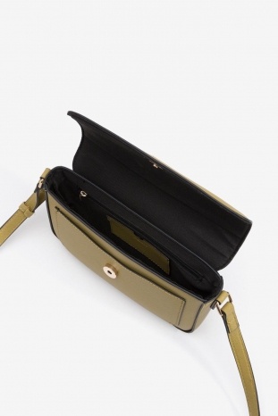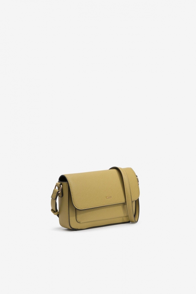 Bolso bandolera rectangular, efecto piel texturizada, con bolsillo frontal y solapa con cierre magnético. Bandolera fija ajustable y bolsillo interior con cremallera. Tamaño Pequeño.