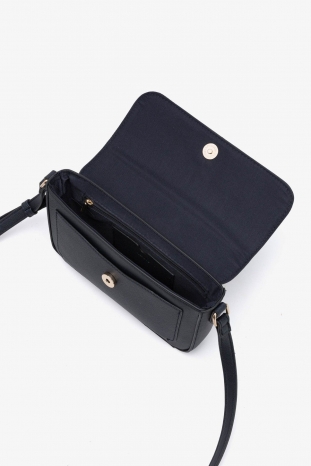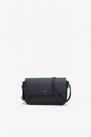 Bolso bandolera rectangular en color azul marino, efecto piel texturizada, con bolsillo frontal y solapa con cierre magnético. Bandolera fija ajustable y bolsillo interior con cremallera.