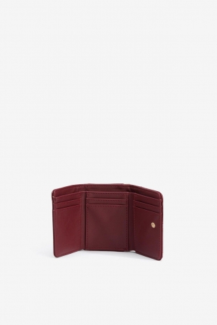 Monedero efecto charol, con solapa acolchada y cierre con pulsador. Bolsillo exterior con cierre a presión y candado, interior con 6 compartimentos para tarjetas y 4 compartimentos para billetes.
