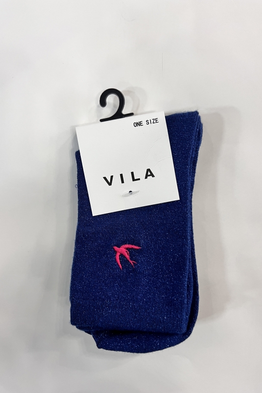 Calcetines Mariam en color azul con lúrex y golondrina bordada en rojo.