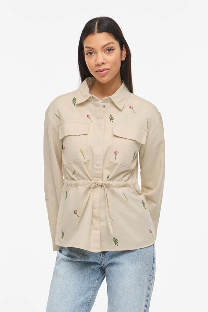 Sobrecamisa tipo sahariana en color beige con bordados florales de Vila.