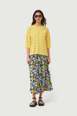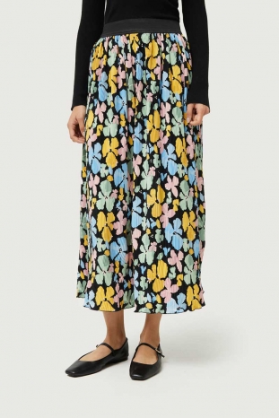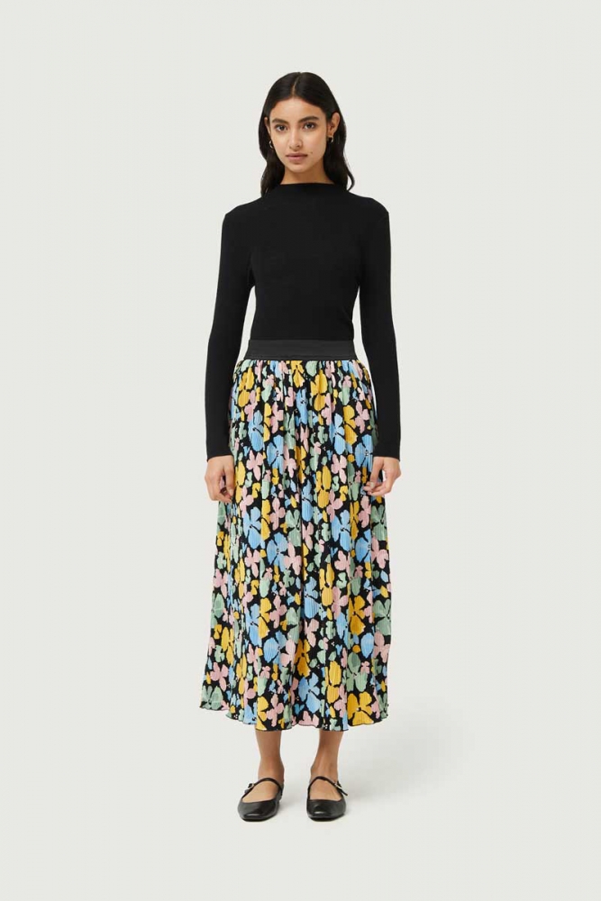 Falda midi con tejido microplisado y estampado de flores en amarillo, azul, rosa y verde sobre fondo negro de la marca Compañía Fantástica.