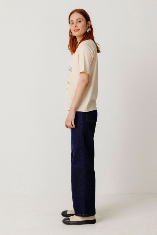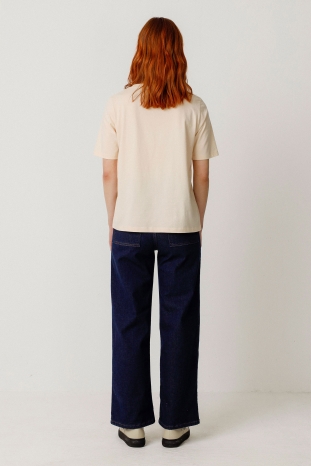 Camiseta Lierni Lucky Cat de SKFK. Beige con estampado de gato de la suerte y mensaje SKFK MADE WITH HEART & FIRE.