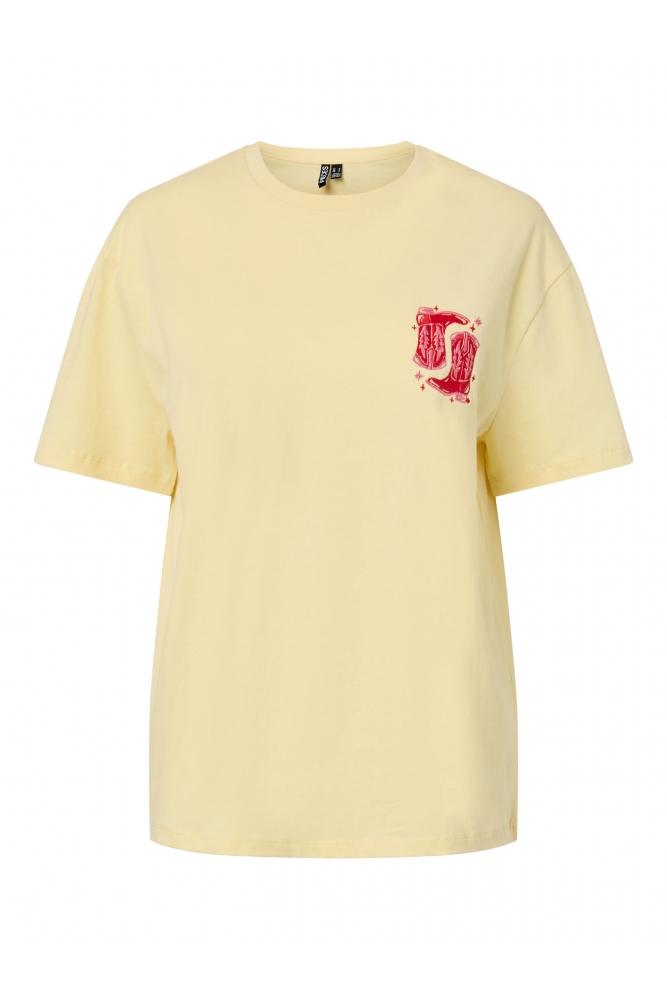 Camiseta Eloise en color amarillo con botas cowboy rojas bordadas de Pieces.