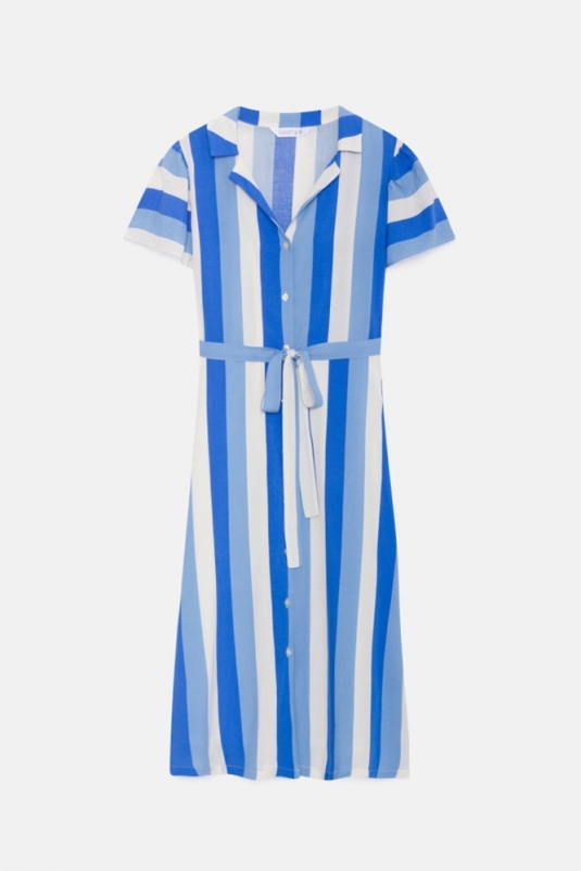 Vestido camisero de largo midi con estampado de rayas en azul y blanco de la marca Compañía Fantástica.