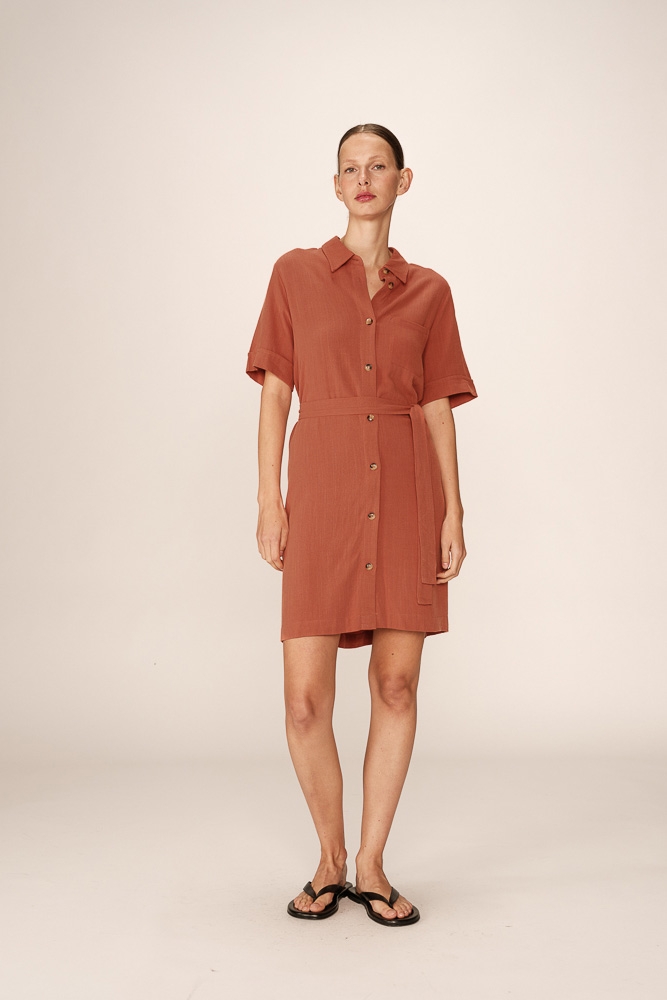 Vestido Paquita de Grace & Mila. Camisero, manga corta y color terracota.