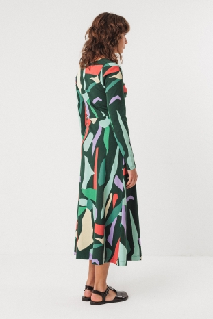 Vestido midi Irantzu en color verde botella con estampado en aguamarina, crudo, lila y color teja de SKFK.